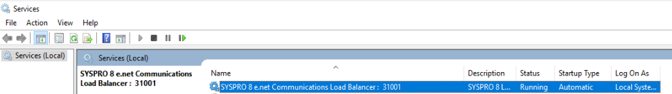 - Ensure that the SYSPRO WCF Service is installed and running on the SYSPRO Server. Note: The name of the service may be slightly different than what is shown below. If the WCF service is not installed, please contact your SYSPRO support provider for instructions on installing this service.