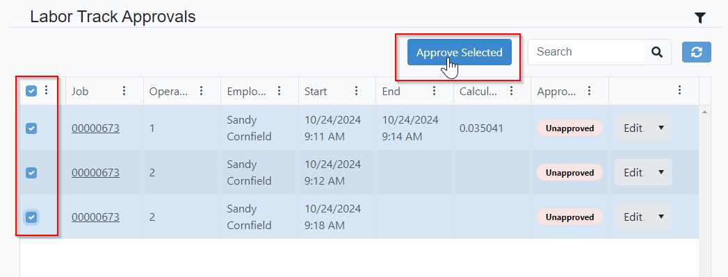 4) Multiple entries can be Approved at one time by using the checkboxes along the left side of the screen and then clicking the Approve Selected button. Multiple items cannot be Edited or Deleted at one time.