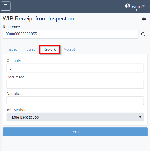 3) Next, select the Rework tab and enter the Quantity to be Reworked if applicable. The Job Method field can be changed from Issue Back to Job or Create New Job to determine how the Reworked items will be processed. Select Post to proceed.